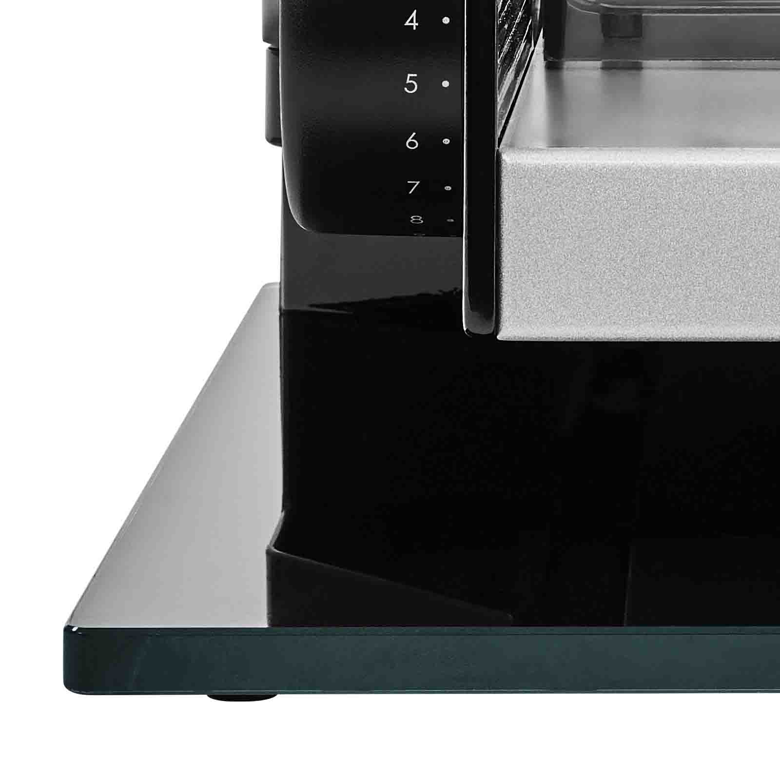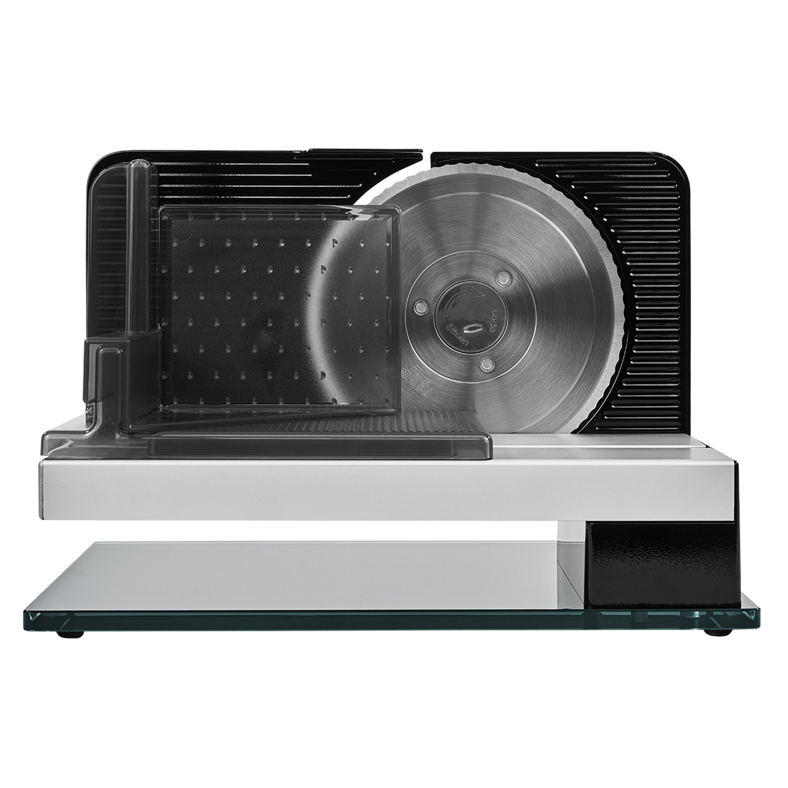 Die freitragende Metallkonstruktion mit stilvoller Bodenplatte aus Glas erlaubt das direkte Ablegen der appetitlich geschnittenen Scheiben auf Teller und Platten. Die Bodenplatte des Allesschneiders besteht aus einem hochwertigen, bruchsicheren Glas und verleiht dem Gerät eine exklusive Anmutung.