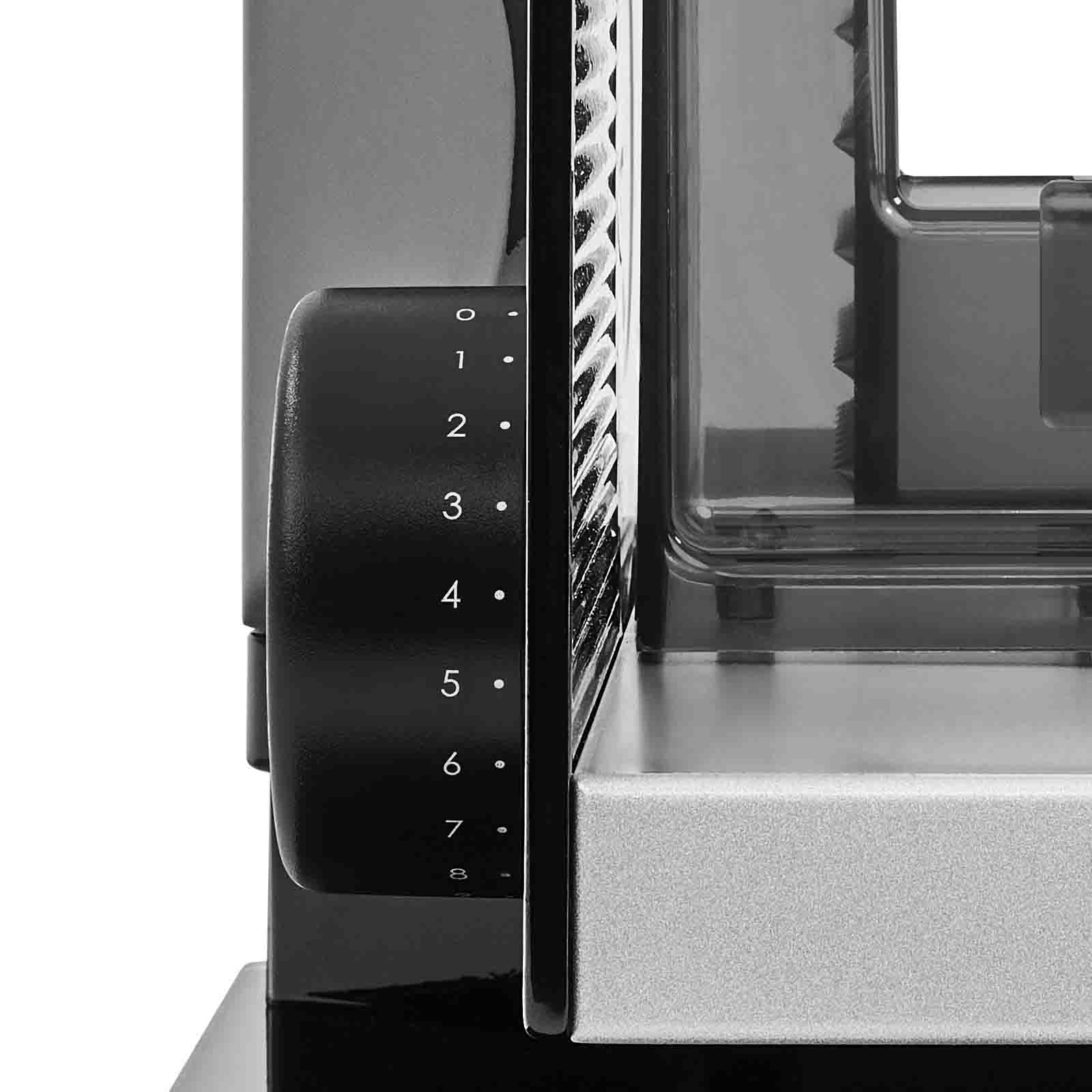 Die Schnittstärke kann stufenlos von hauchdünn bis ca. 20 mm eingestellt werden. Bei übergroßem Schneidgut kann der Schlitten abgenommen werden.