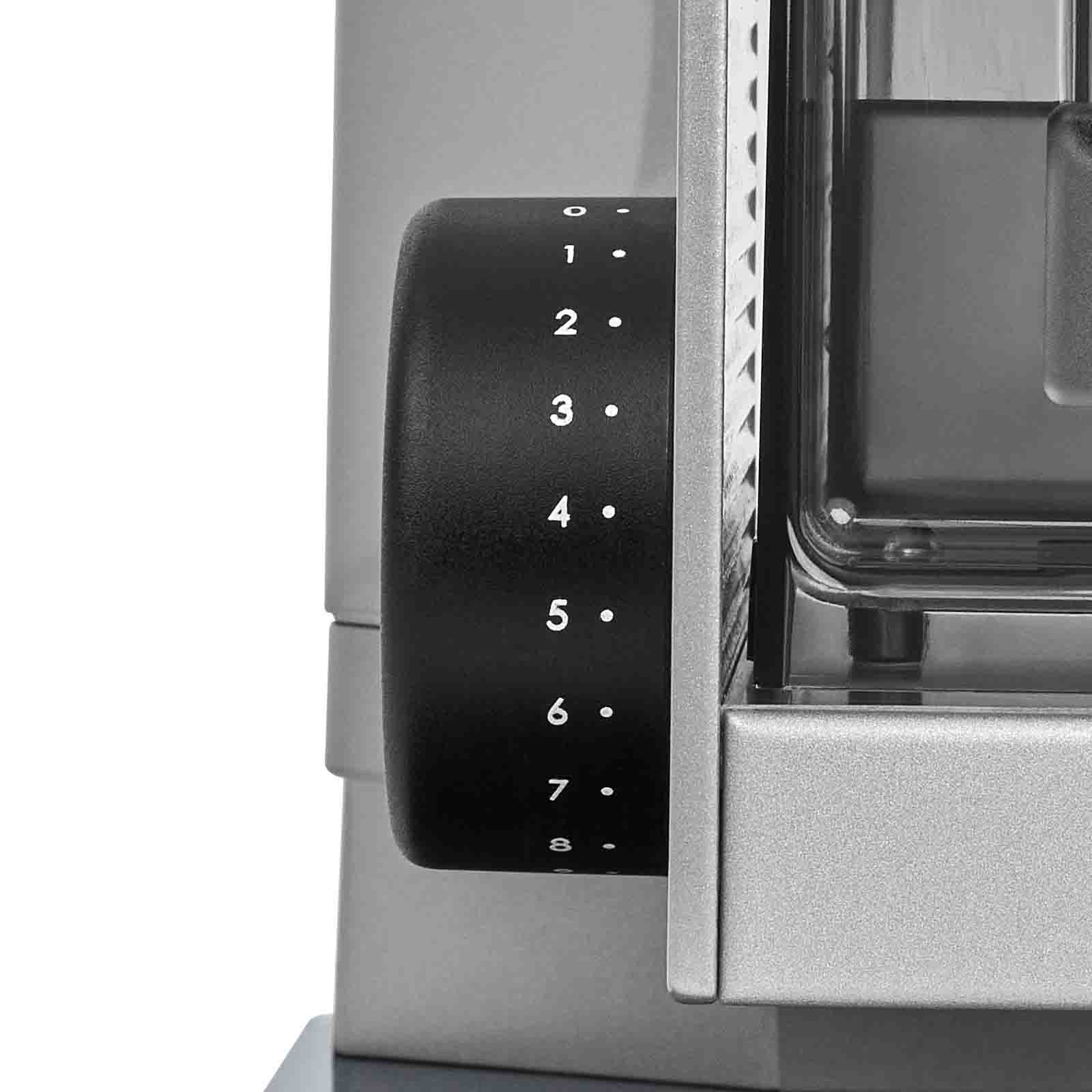 Die Schnittstärke kann stufenlos von hauchdünn bis ca. 20 mm eingestellt werden. Bei übergroßem Schneidgut kann der Schlitten abgenommen werden.