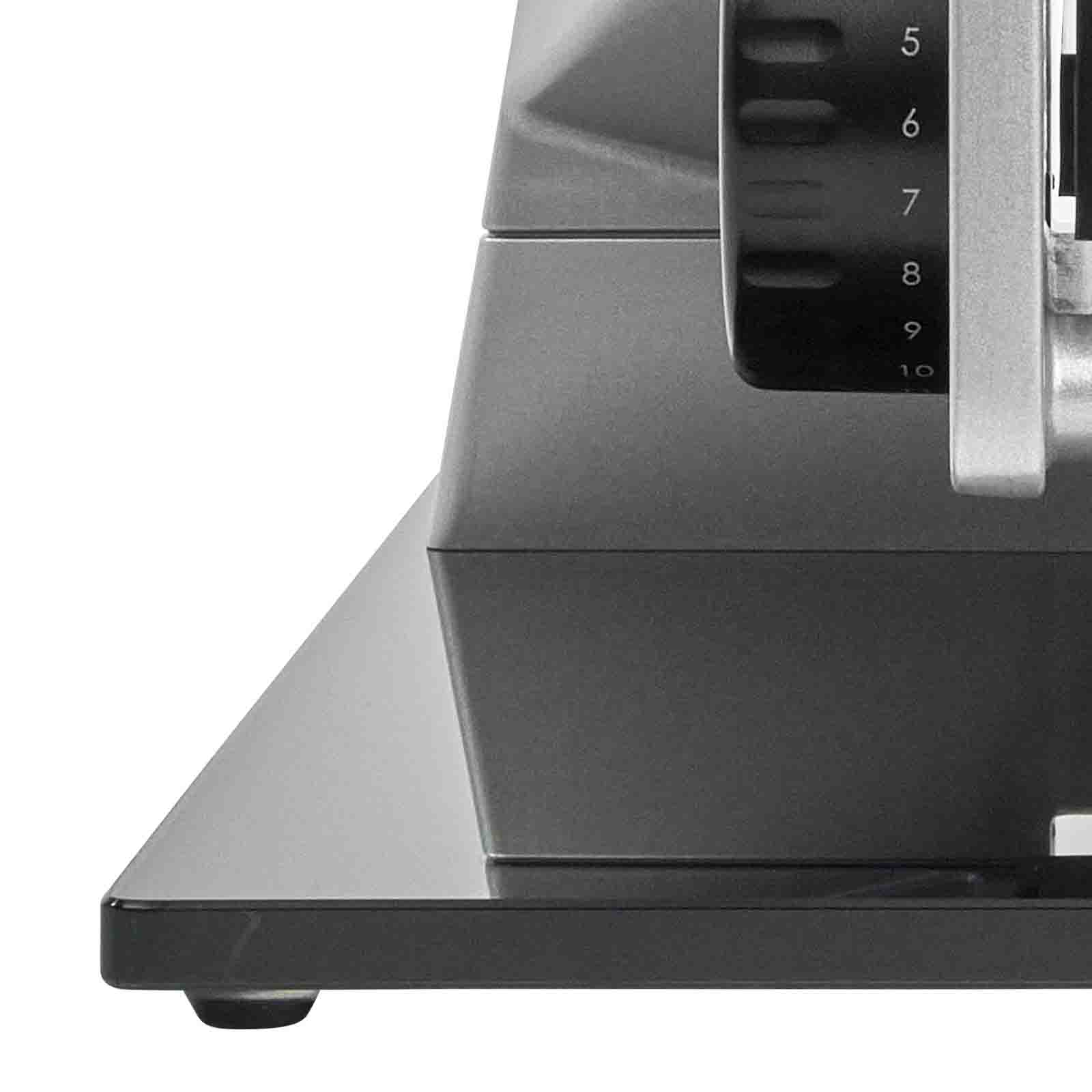 Die Bodenplatte aus hochwertigem und bruchsicherem Sicherheitsglas verleiht dem Allesschneider sono5 ein elegantes & stilvolles Design.