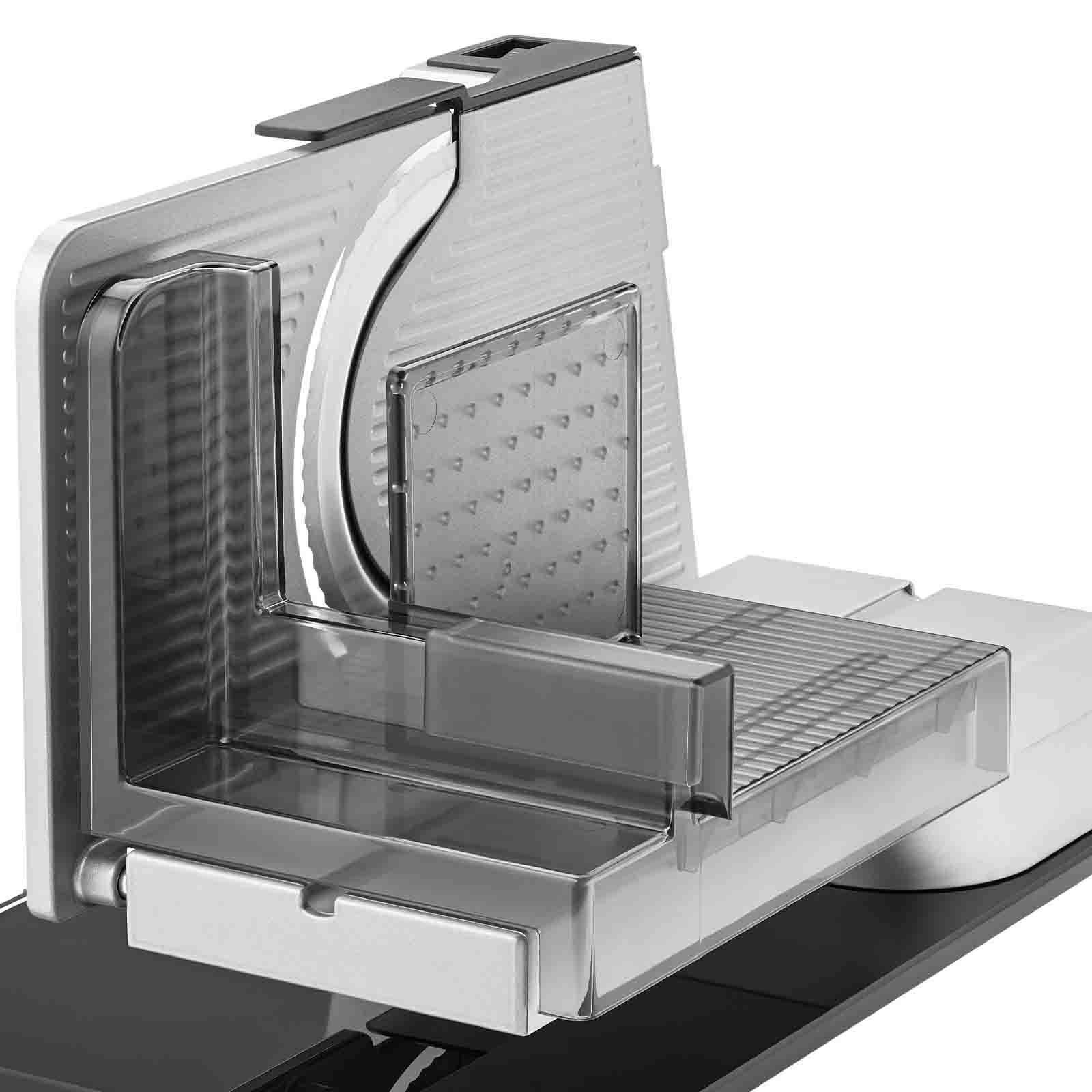 Die Bodenplatte besteht aus einem hochwertigen, bruchsicheren Sicherheitsglas und verleiht dem Allesschneider eine exklusive Anmutung. Durch die freitragende Konstruktion ist es zum einen möglich, die aufgeschnittenen Scheiben direkt auf großen Tellern und Platten abzulegen und zum anderen das Gerät bequem und einfach zu reinigen. Die Vollmetall-Ausführung bietet zudem ein hohes Maß an Stabilität und Schneidleistung.