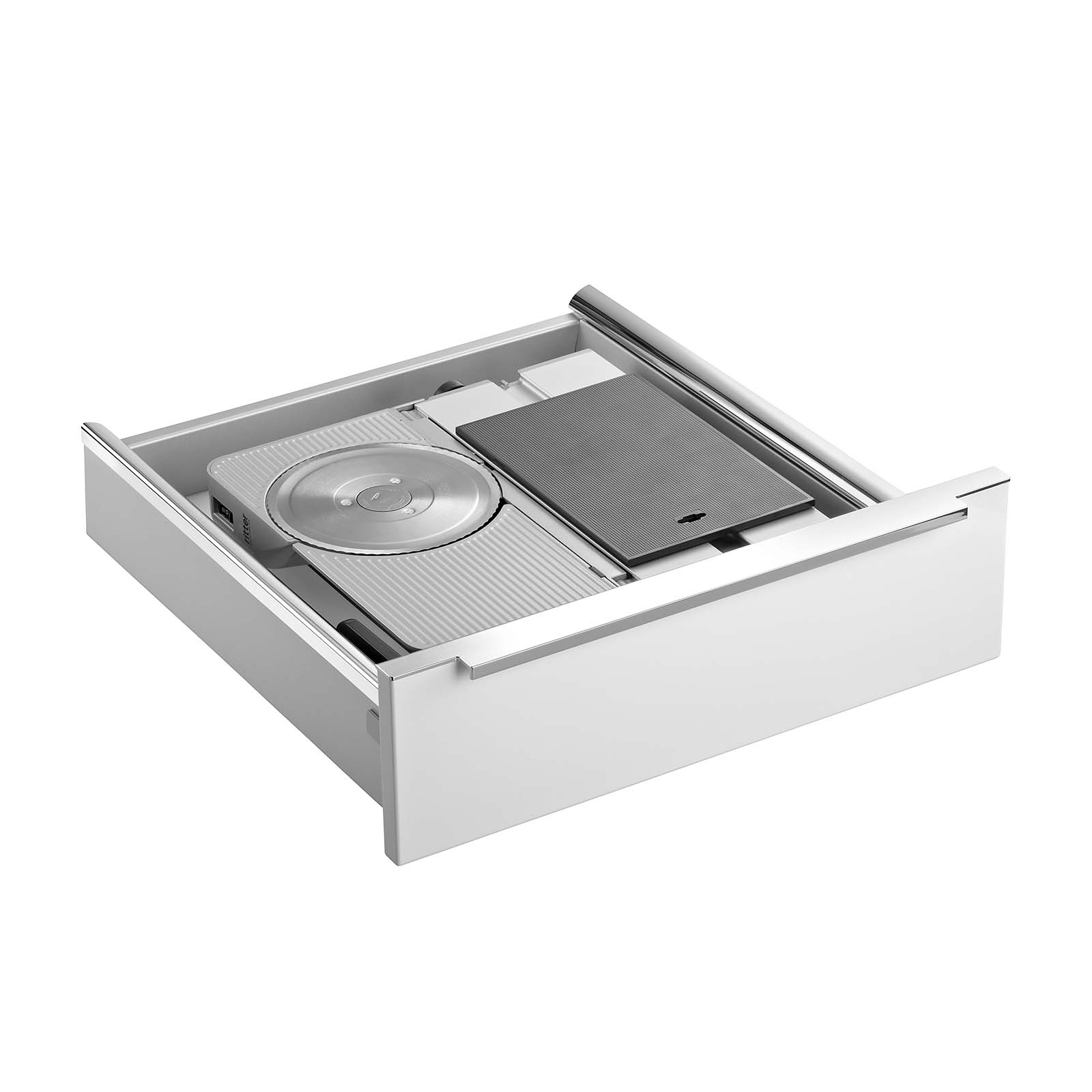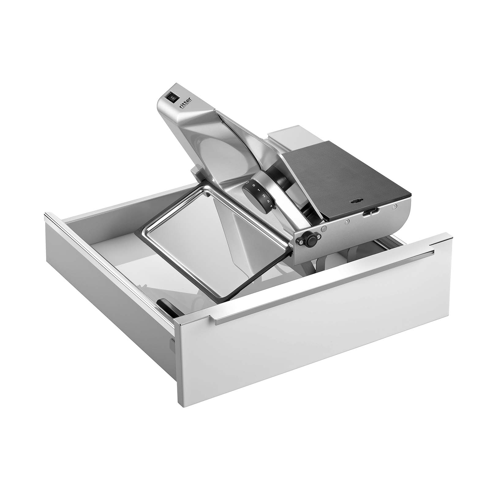 In Küchenschubladen eingebaute Allesschneider sind platzsparend und dabei doch immer griffbereit. Die Einbaulösung schafft zudem noch Platz auf der Arbeitsplatte.
