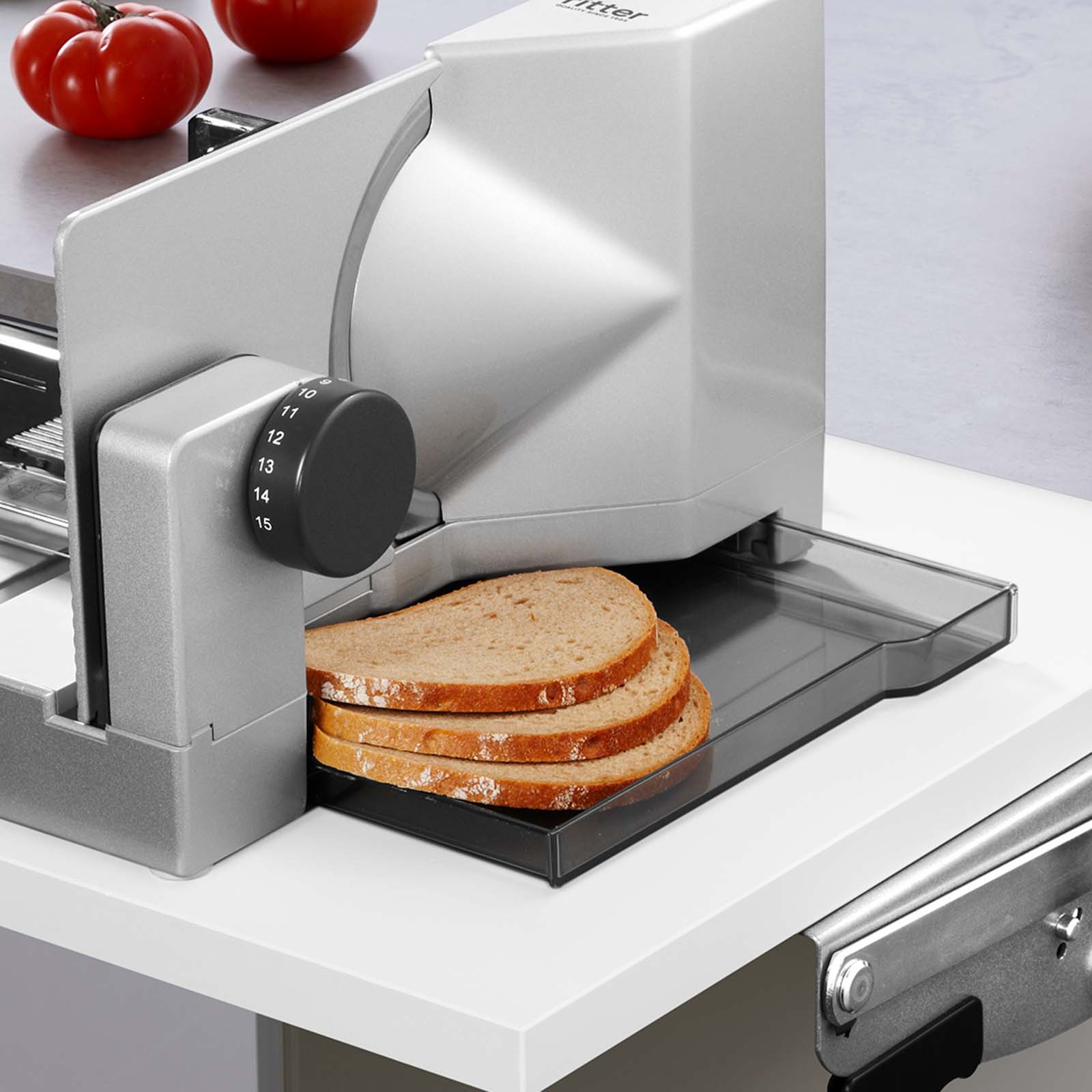 Mit dem Einbau-Allesschneider E 118 können Lebensmittel kinderleicht in gleichmäßige Scheiben geschnitten und zubereitet werden, denn die Schnittstärke ist ganz nach Belieben von hauchdünn bis ca. 14 mm präzise einstellbar.