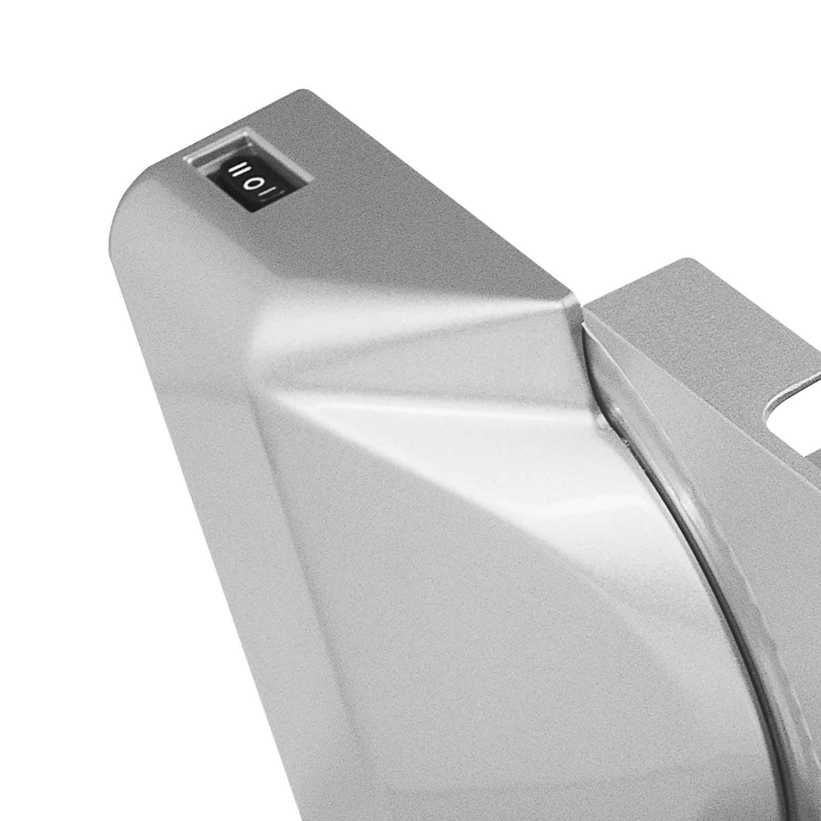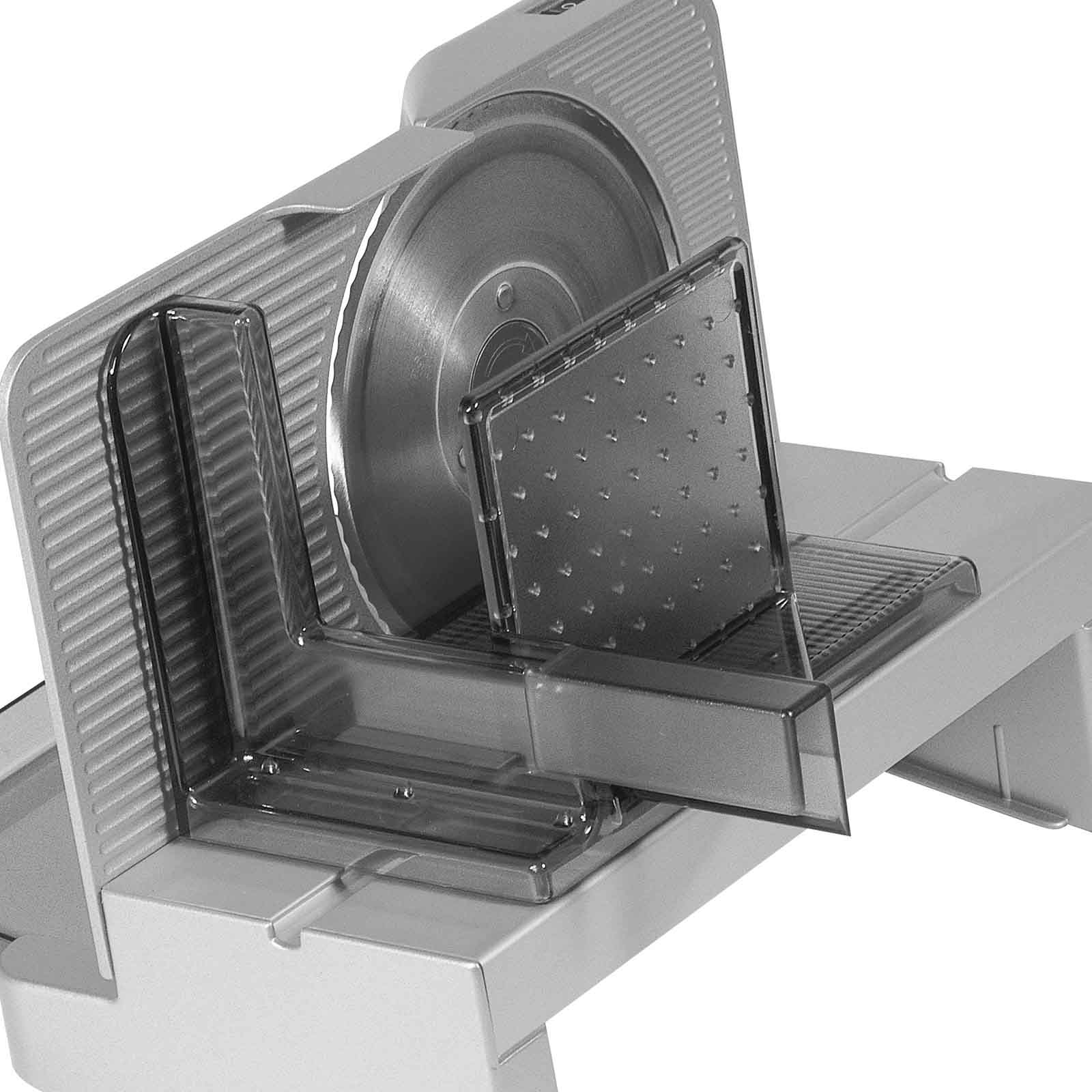 - Features metal construction, inclined silver metallic serrated circular blade, 17 cm Ø slice thickness adjustable up to approx. 20 mm More