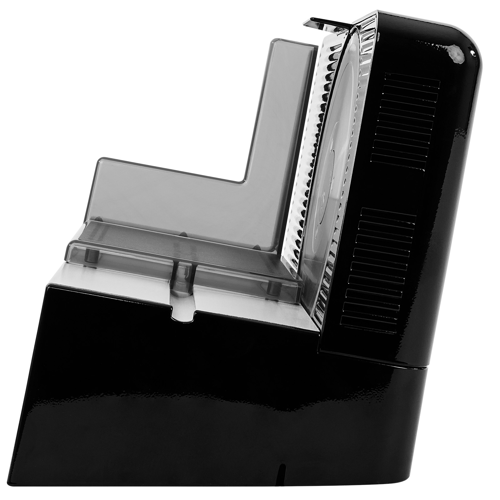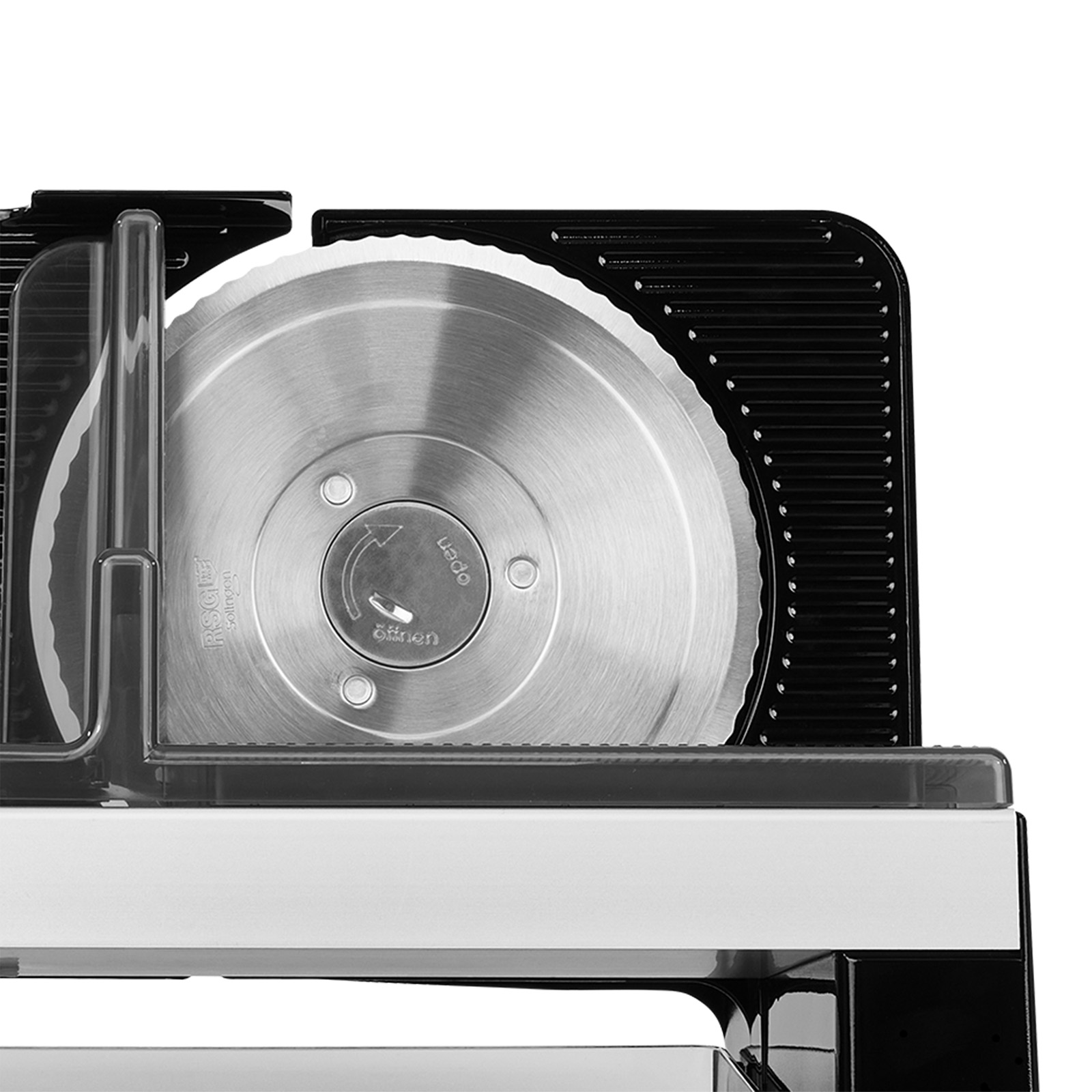 The food slicer is equipped with a serrated circular blade, a switch for intermittent and continuous operation, a food tray and cable compartment.